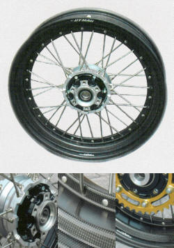 DYMAG bringt mit dieser Felge eine bahnbrechende Neuerung auf den Markt ! nämlich einen Kohlefaserverbund-Aussenring der mit VA-Drahtspeichen in einer Aluminium-Nabe eingespeicht ist ! Gewicht des Carbon-Felgenbettes beträgt beim Vorderrad 3,5x17 nur 1,6 kg und beim Hinterrad 5,5x17 nur 2,2 kg geschlossenes Felgenbett, für schlauchlose Reifen, mit hochwertiger aus dem Vollen gefräster Aluminium-Radnabe modellbezogene Radadapter wahlweise aus Magnesium oder Aluminium die Räder werden einbaufertig inkl. Ruckdämpfer, Kettenradträger und hochwertigem Alu-Kettenrad geliefert ! erhältlich in 3.5x17" vorne und 5.5x17" hinten Achtung ! werden nicht mehr produziert ! Neuauflage wird erst ab mindestens 10 Satz realisierbar ! früherer Preis pro Satz ca. 2600,- Euro |
